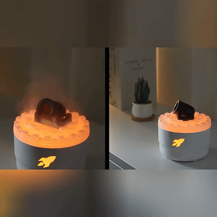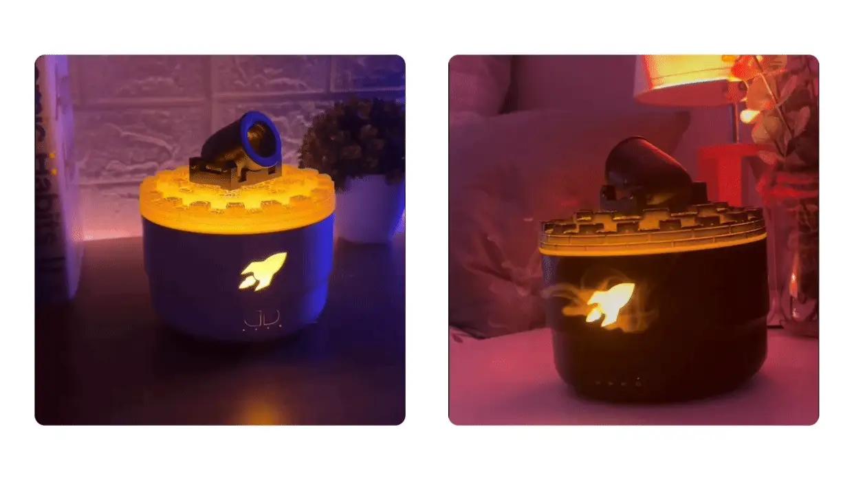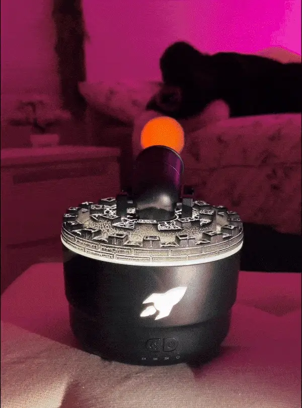 - [Efect LED Colorat]: Umidificatorul aromaterapeutic Cannon Blast ofera culori ajustabile, care se pot regla in functie de starea ta de spirit si schimbarile mediului, fiind suficient de versatil pentru a se adapta oricarei scene. Efectul luminos atmosferic in mai multe culori se combina cu efectul de flacara, sporind atractivitatea vizuala a spatiului.